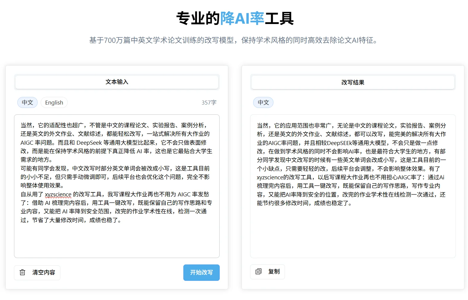 而 xyzscience 的改写工具,就是专为学术场景打造的降 AI 率神器,完美适配大学生的课程大作业需求,和普通工具比起来,优势真的太明显了!